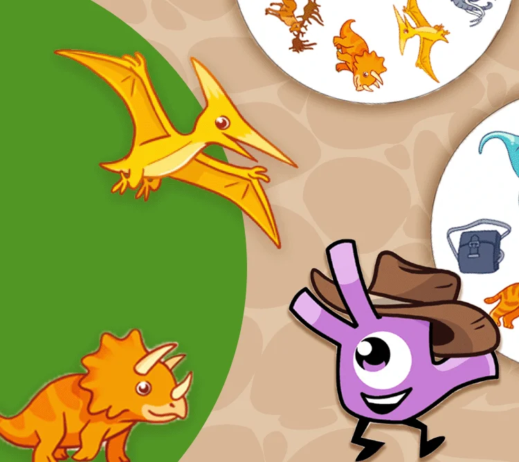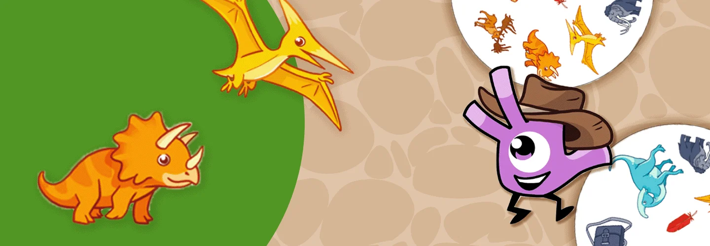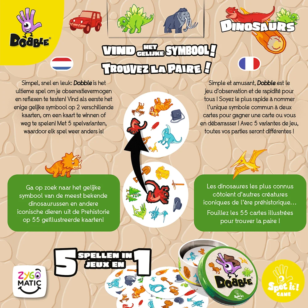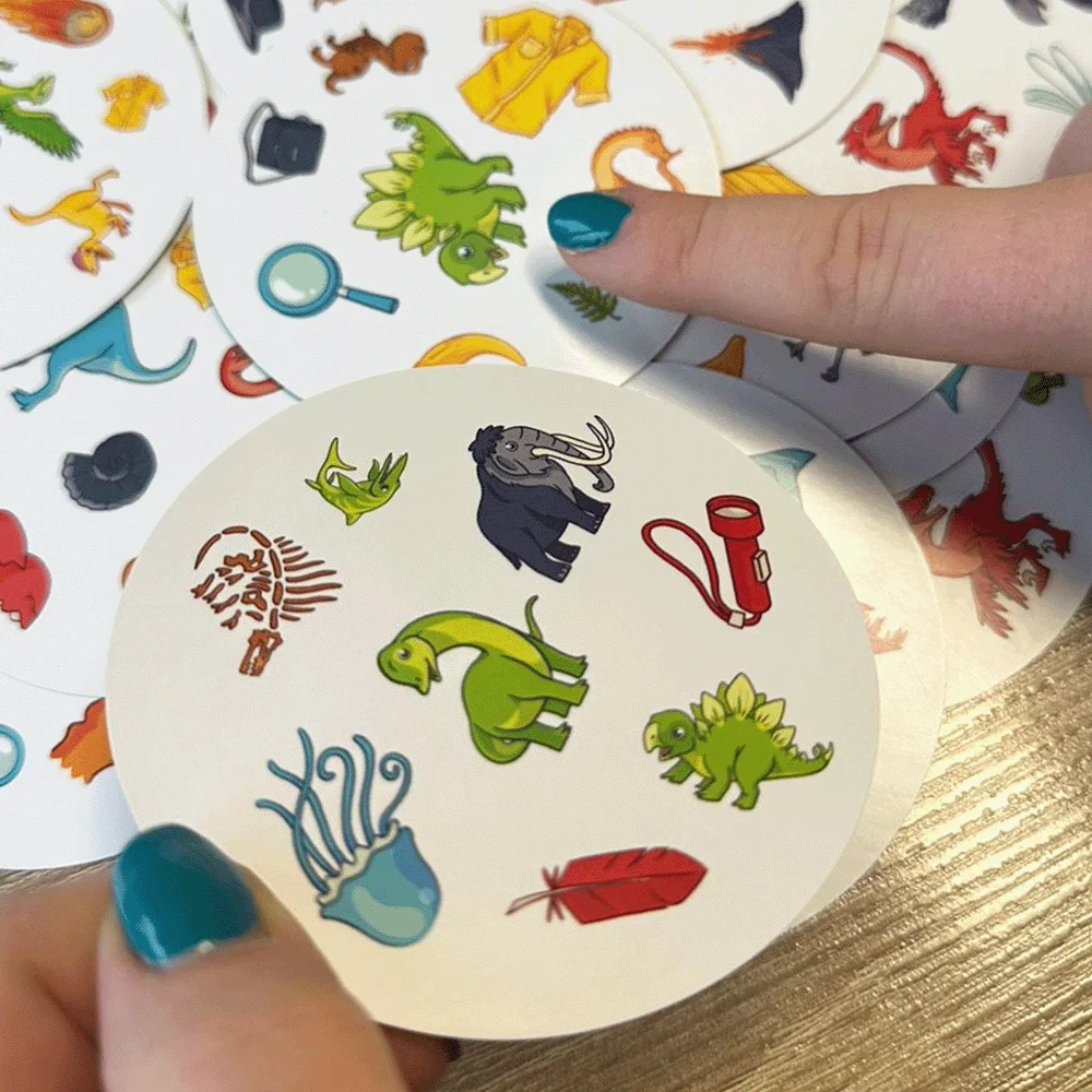 Op elke kaart staan afbeeldingen die met dino’s te maken hebben, zoals een T-rex, een vulkaan, een dinosaurus-ei of een fossiel. Tussen twee kaarten zit altijd precies één gelijke afbeelding. Zie jij deze als eerste? Roep het plaatje en win de ronde door als eerste jouw kaarten kwijt te raken.