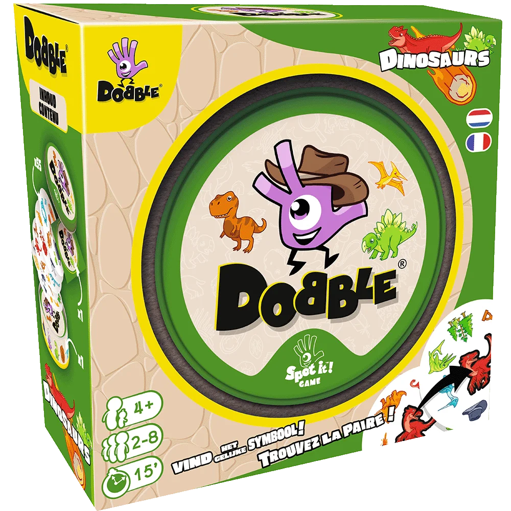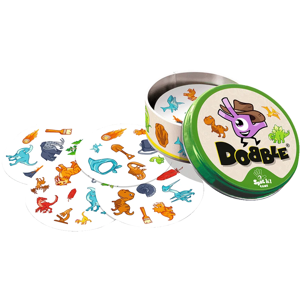 Dobble Dinosaurs is snel, grappig en zit vol dino-actie. Kijk, roep en win!