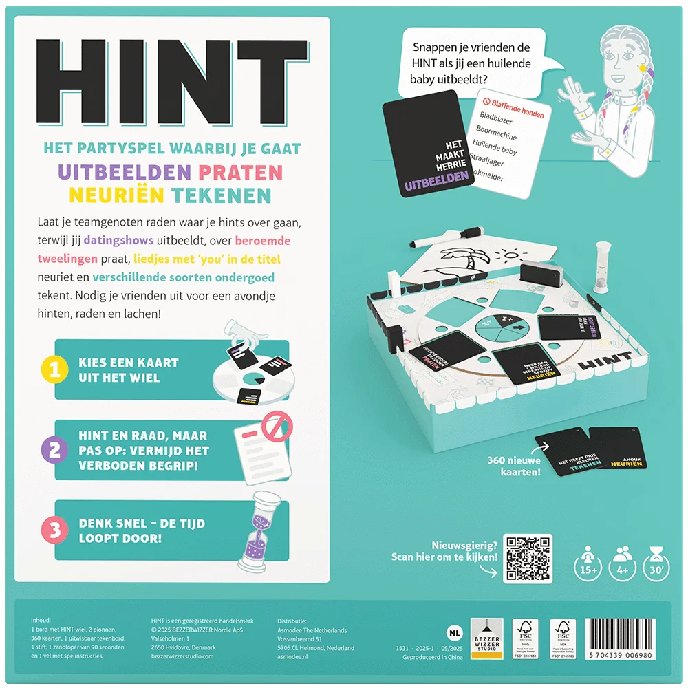 HINT is hét party-spel waarin jouw teamgenoten moeten raden wat jij met jouw hints bedoelt. Je uitdaging? Teken, praat, beeld uit of neurie alles wat te maken zou kunnen hebben met Filmschurken, Landen aan de Evenaar, Haarstijlen, Hits van de 90's en veel meer. Wees snel, creatief en alert! Je komt niet meer bij van het lachen bij het geven, raden maar ook stelen van een hint!