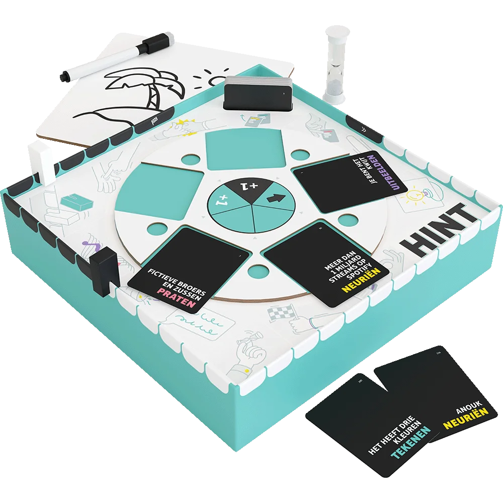 Het spel HINT, geschikt voor spelers van 15 jaar en ouder, heeft een speelduur van ongeveer 45 minuten. Dit geeft je ruim voldoende tijd om te zien welke speler een neurie-talent is, een artistieke knobbel heeft of juist erg goed is in iets nadoen! Met HINT maak je op een slimme manier gebruik van je brein. Het spel test niet alleen je creativiteit maar ook je communicatie skills.